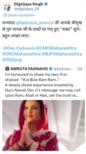 अमृता फडणवीस यांनी नुकतंच त्यांच्या नवीन भजन “कोणी बोले राम राम, कोणी खुदाएँ” हे रिलीज केले आहे, ज्याने सोशल माध्यमांमध्ये मोठ्या प्रमाणावर प्रतिसाद मिळवला आहे.